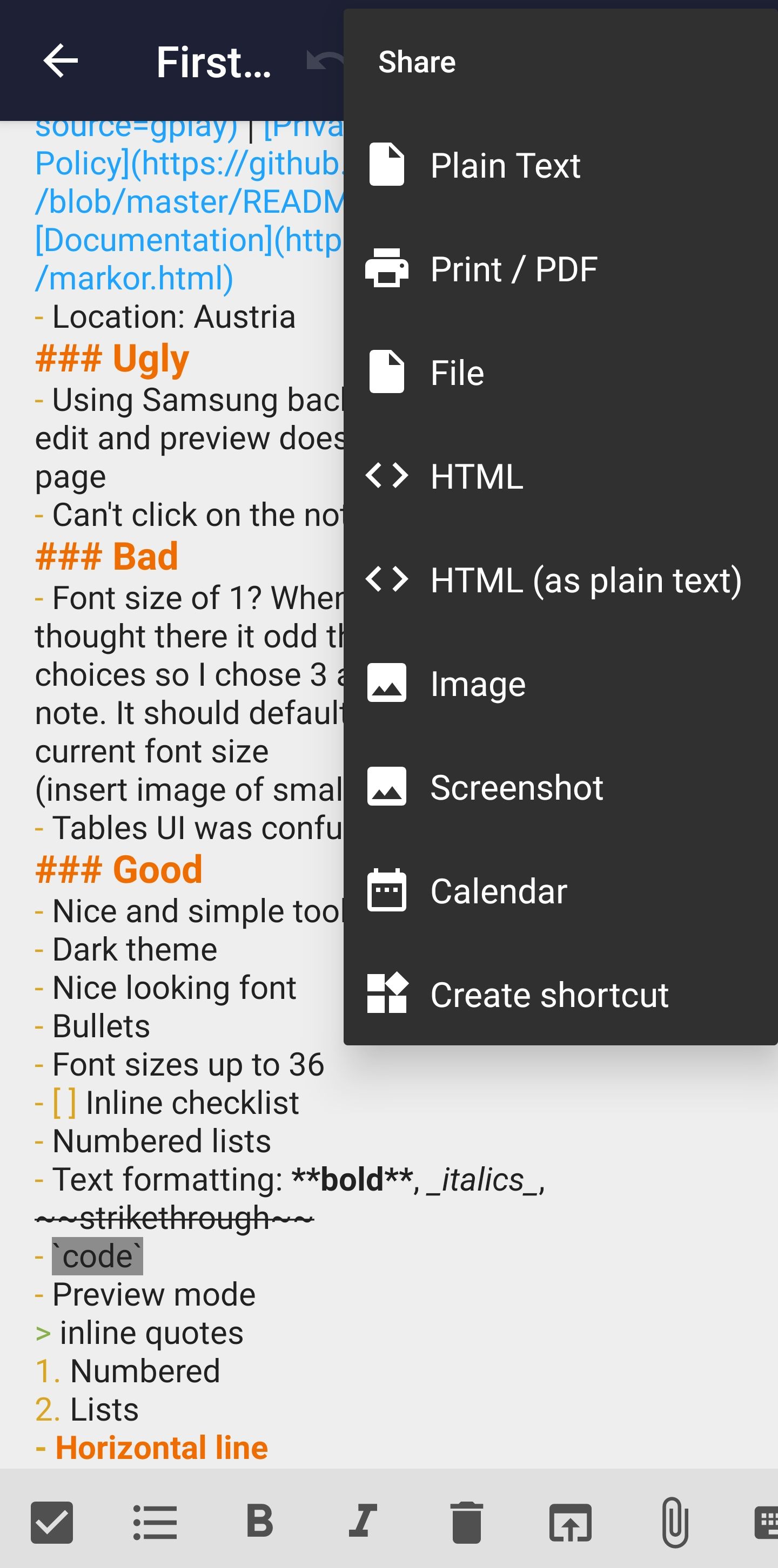 I downloaded Markor and never got around to trying it. I remember seeing the app icon and thinking it was cheesy and the screenshots on the Play Store didn't look very good. Later on, I saw it mentioned a few places especially as I started looking for apps that have Markdown support. Then, last week I created r/noteapps subreddit (shameless plug) and someone replied to my initial post with three words: