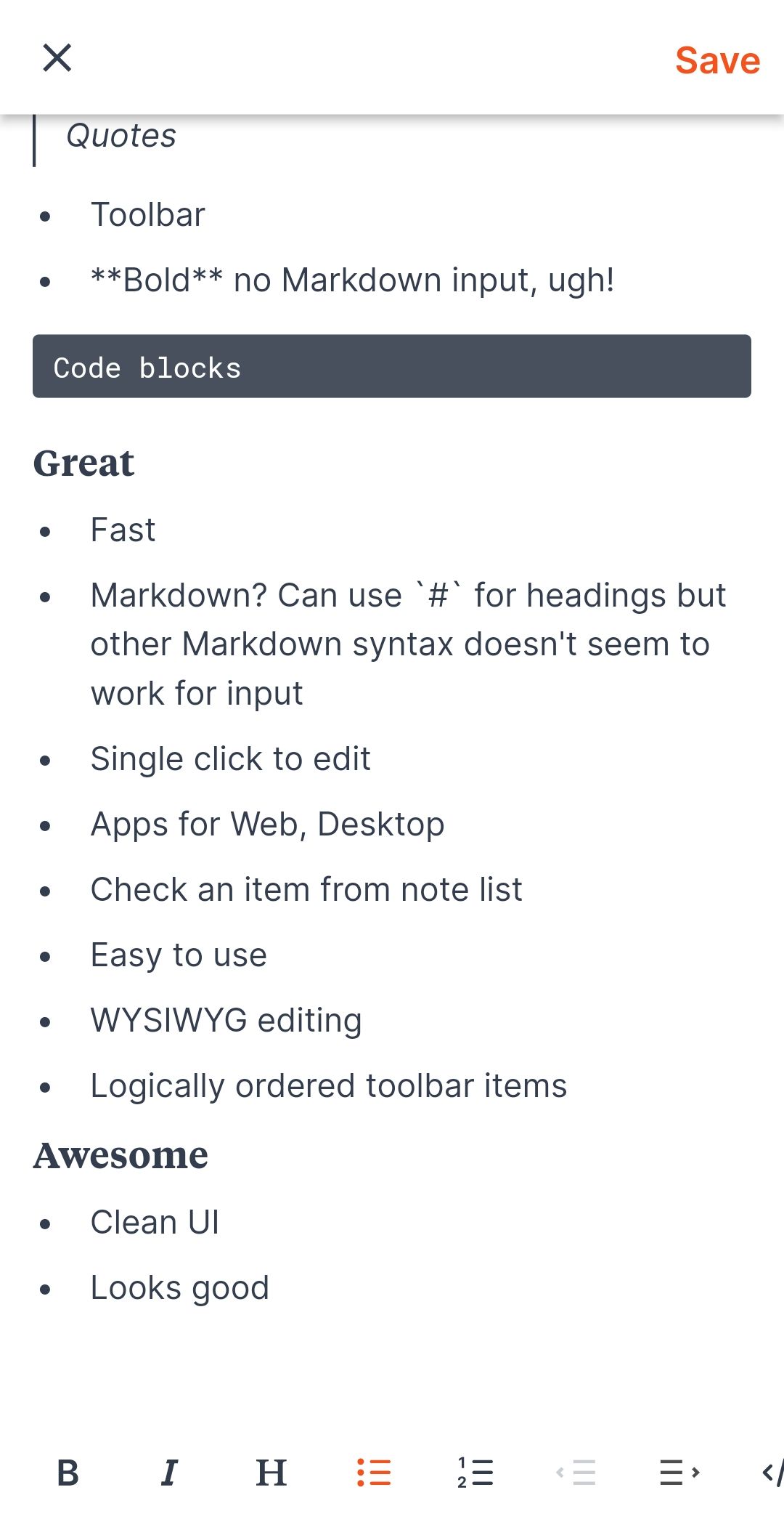 Overall, the mobile app is good for quick input. It's got a clean user interface and it's fast, but it doesn't stand on its own that well. Markdown works well on the Web but on Android, it has very limited support. The Android app has no export options, no custom settings, no tags, and no dark mode. It's understandable why the Google Play score is 2.8 stars.