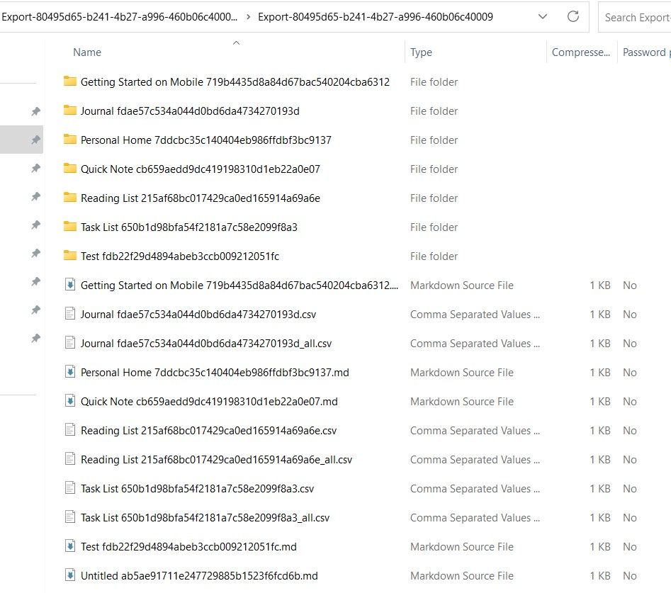 You can quickly export all of your content via the Web with just a couple of clicks which is extremely important for a cloud service. The ugly part of this is the internal Notion identifiers appended to file and folder names. At least you can get your data out!