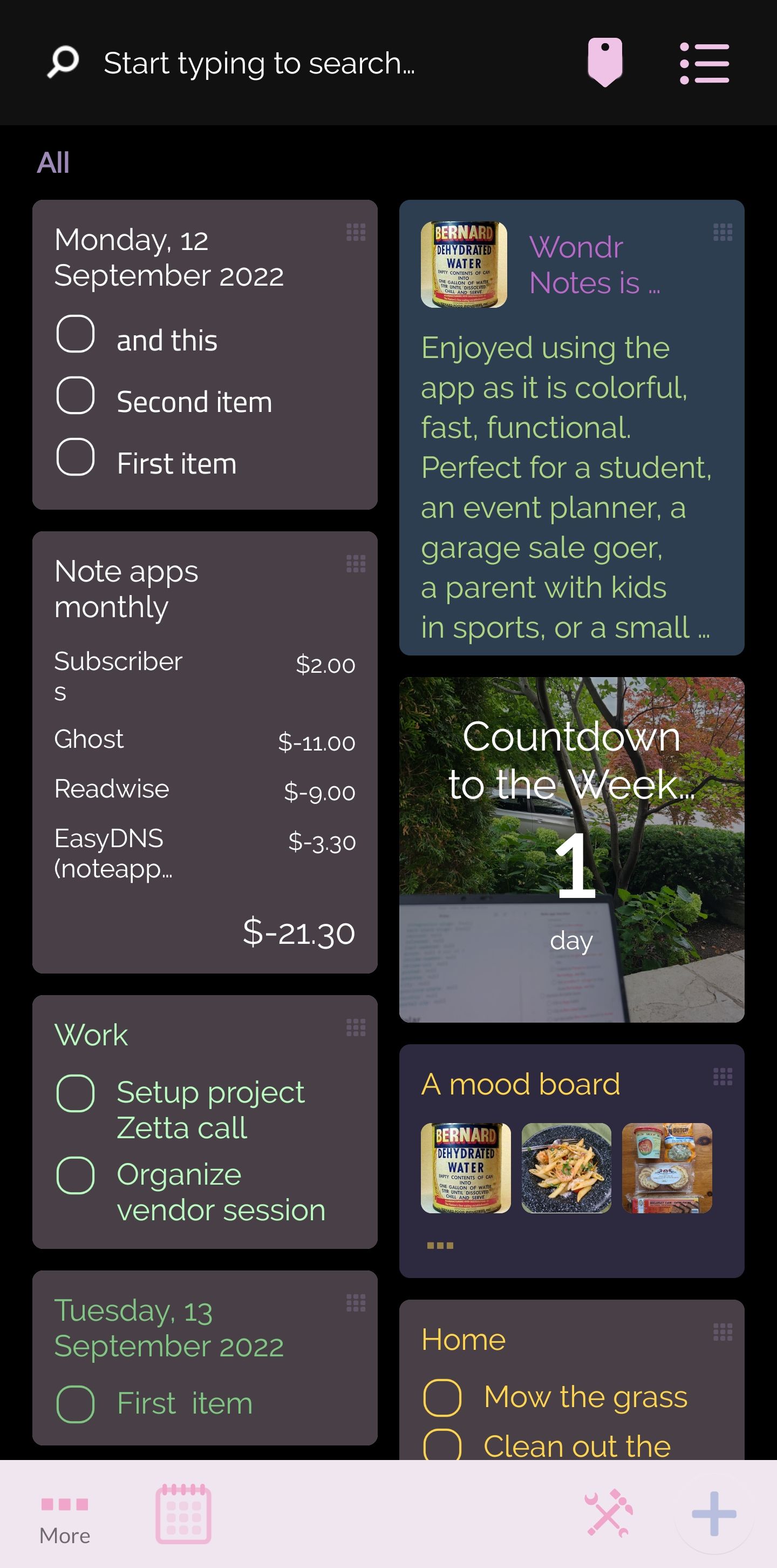 Wondr Note has tons of features including a handy expense/cost tracker, simple task tracking with the ability to finish a task from the note list, and a "mood board" with a collection of photos. You can attach images and they're shown with thumbnails in the note list which is something I always like. Well done.